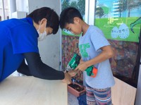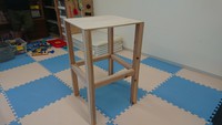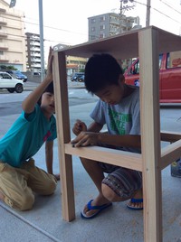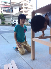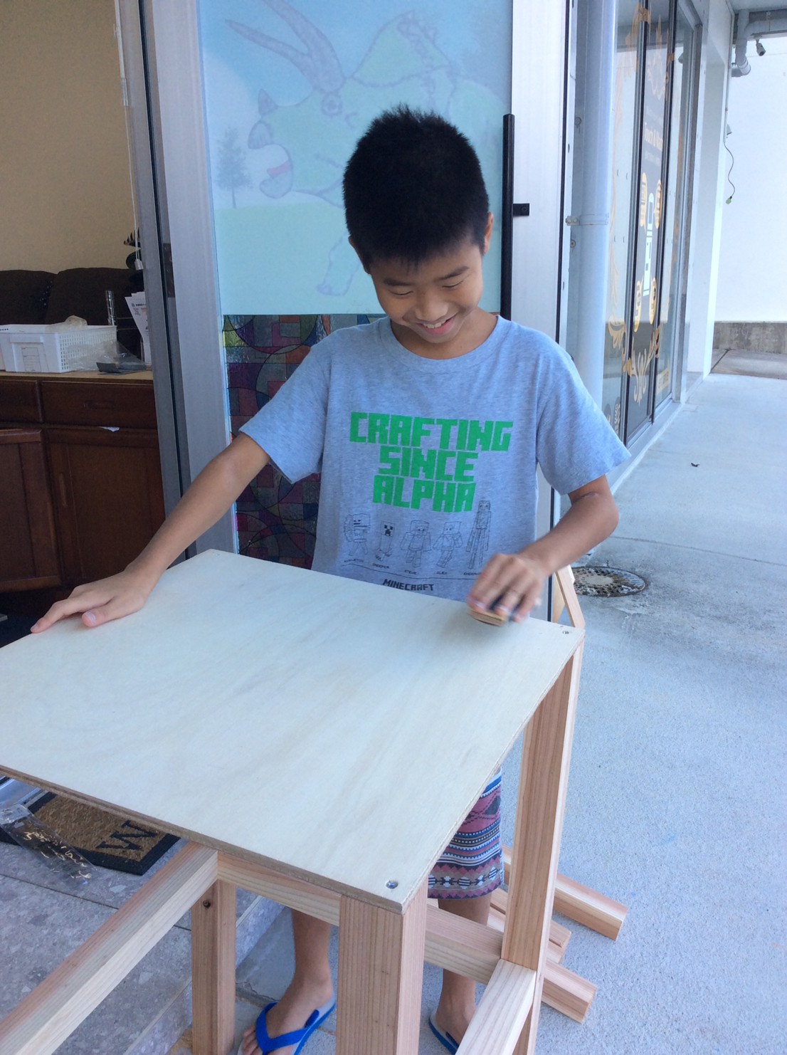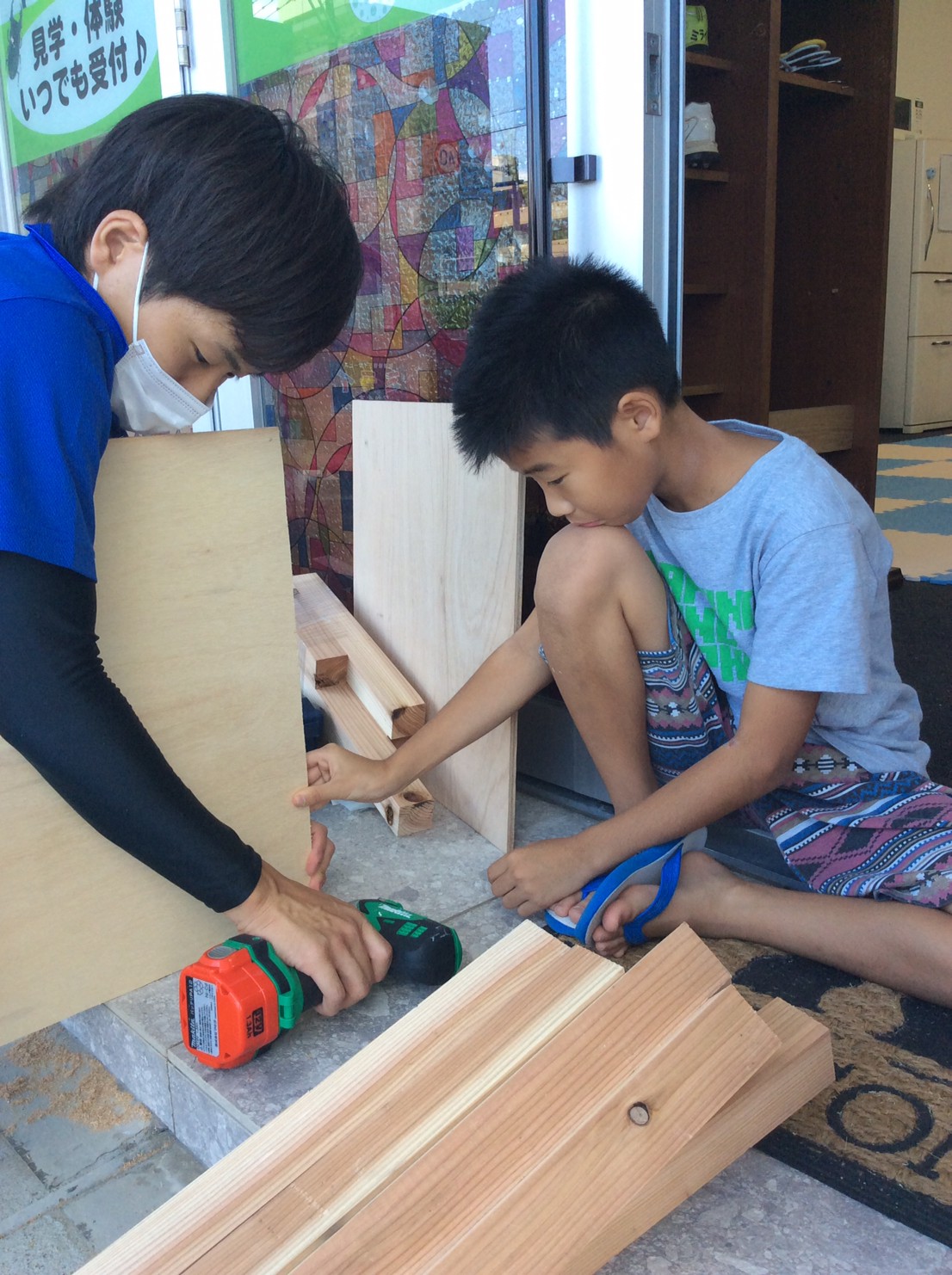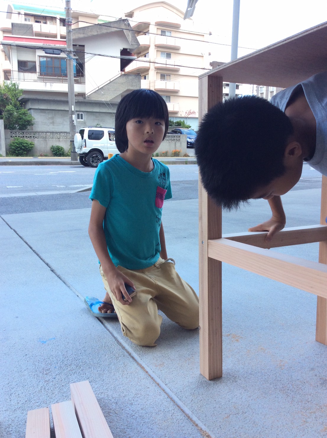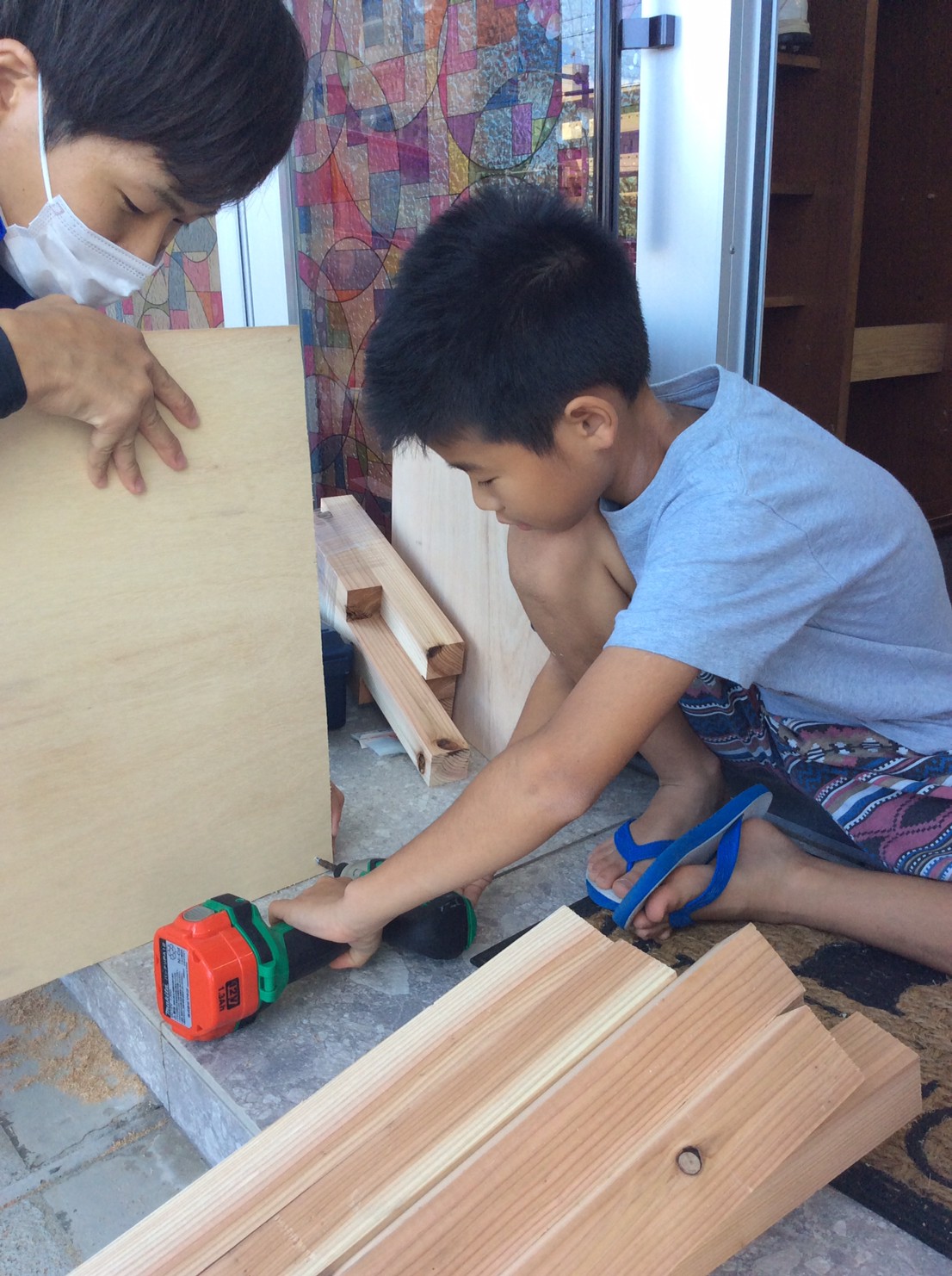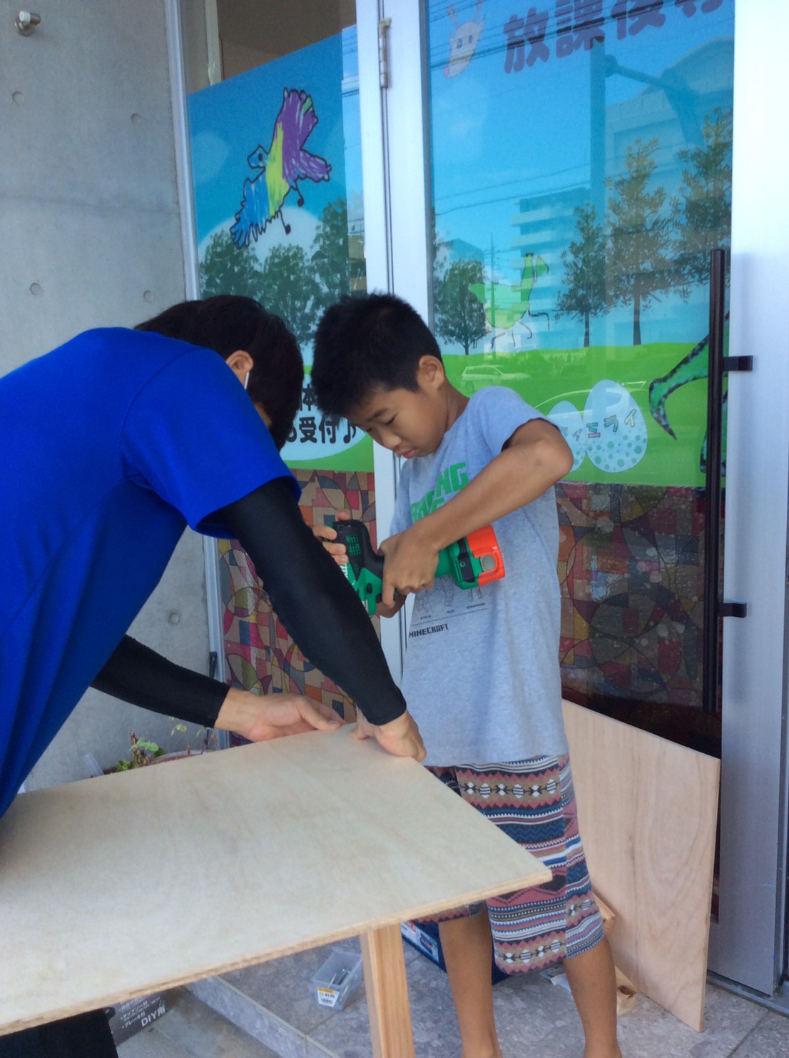 消毒アルコール置き場のテーブルを、子供たちと一緒に作りました!!