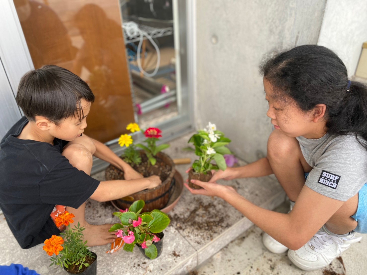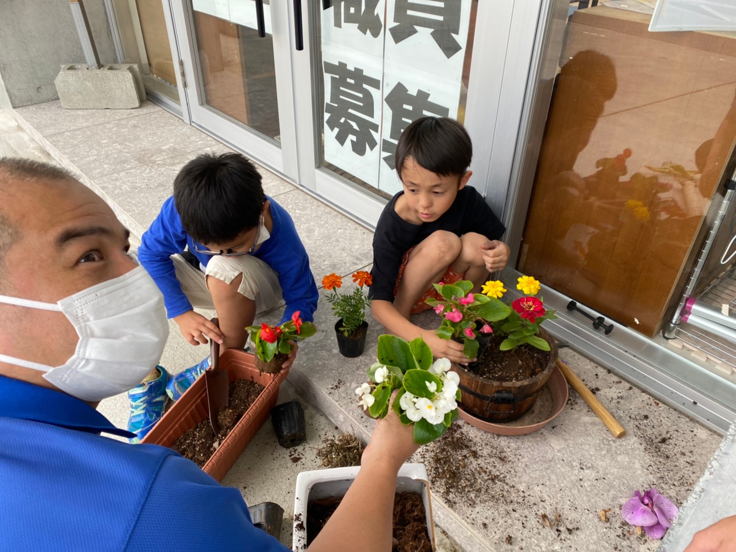 玄関に置いてあるお花を、新しいプランターに植え替えてます!
